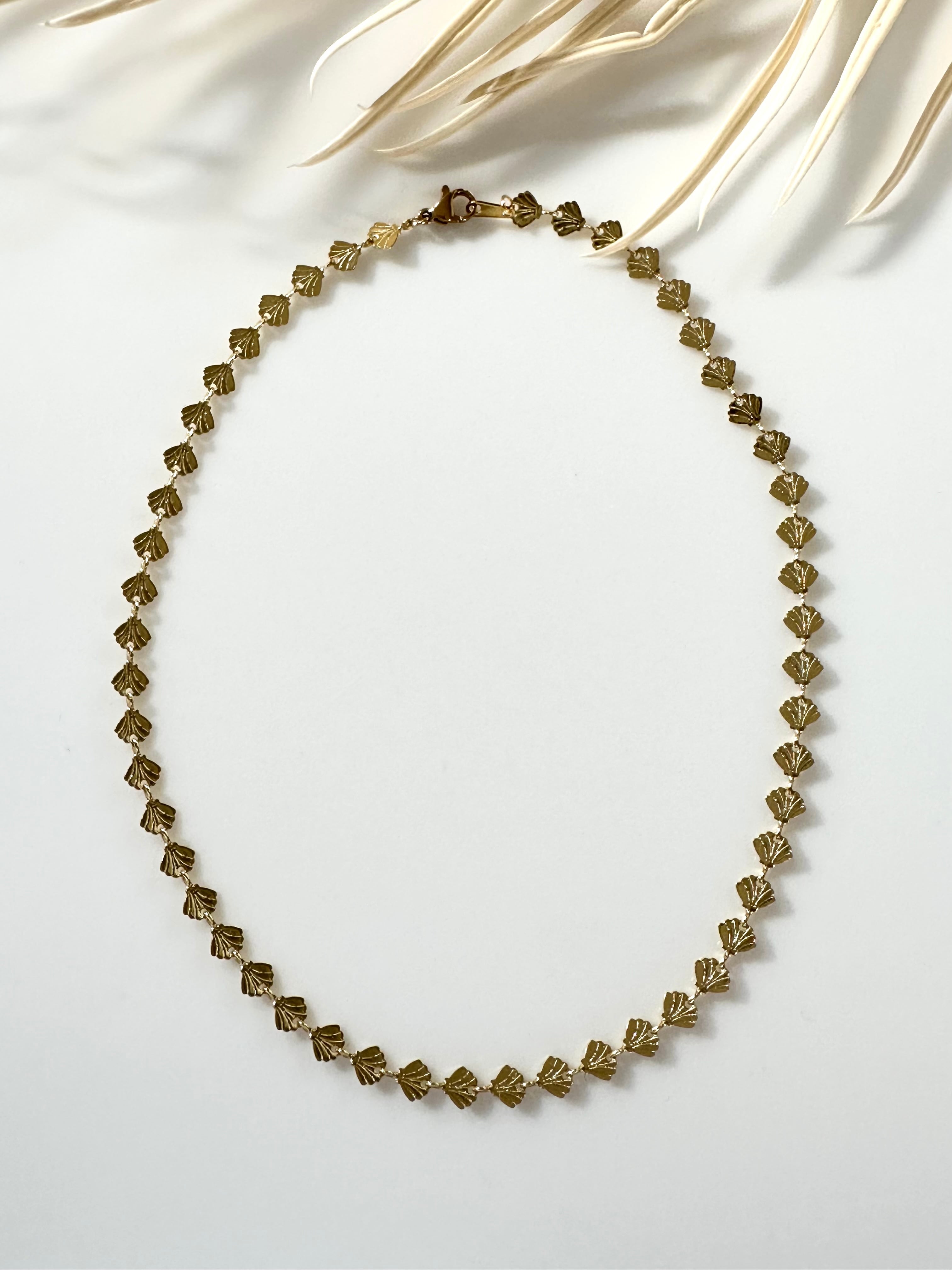 小さなシェルがリズミカルに並ぶ、繊細なデザインのネックレス。